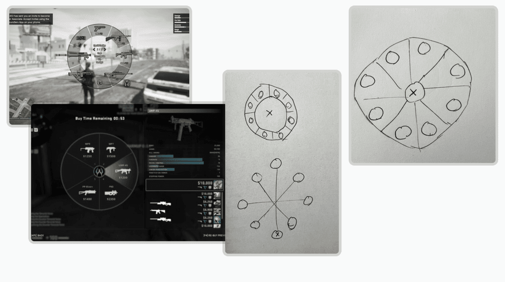 To explore interaction elements, the decision was made to conduct research in the realm of game design, specifically examining various menus found in action games where players need to make quick decisions. This approach aims to gather insights on effective design patterns for enhancing decision-making speed in user interactions.